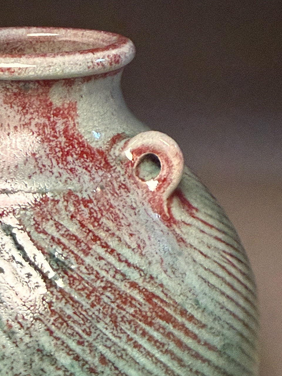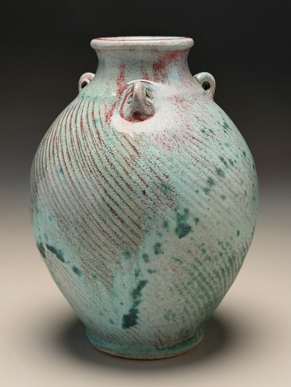 A classic vase shape that is influenced by Ben III’s time in Japan studying traditional Japanese styles of pottery making and kiln building. The Patina Green glaze has a variety of colors as you look around the surface. A conversation piece, for sure. Measuring 5.75”w x 8”h.
