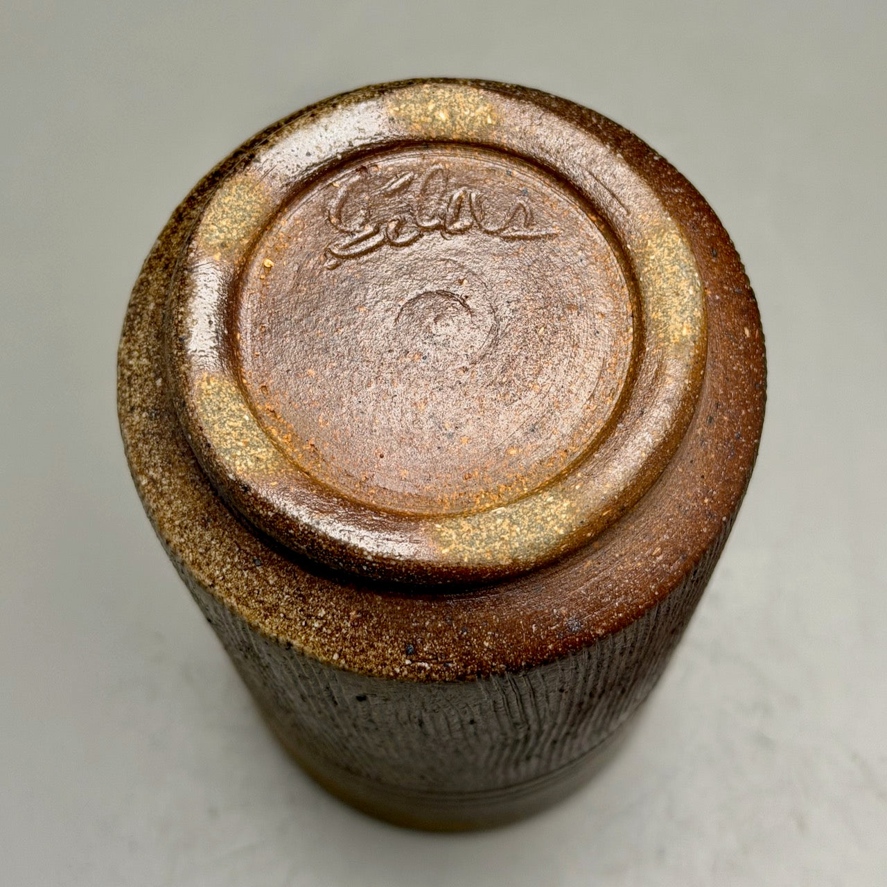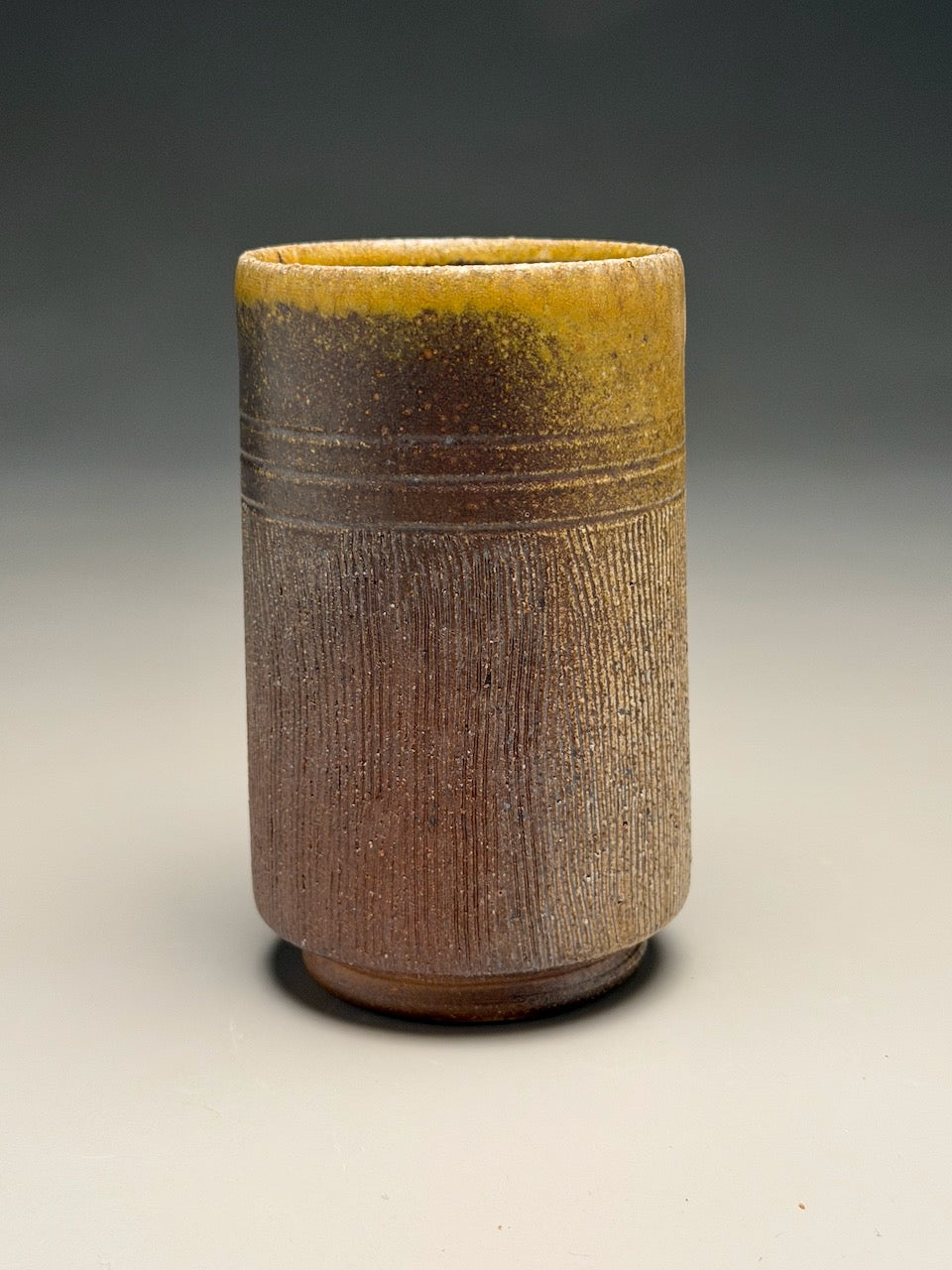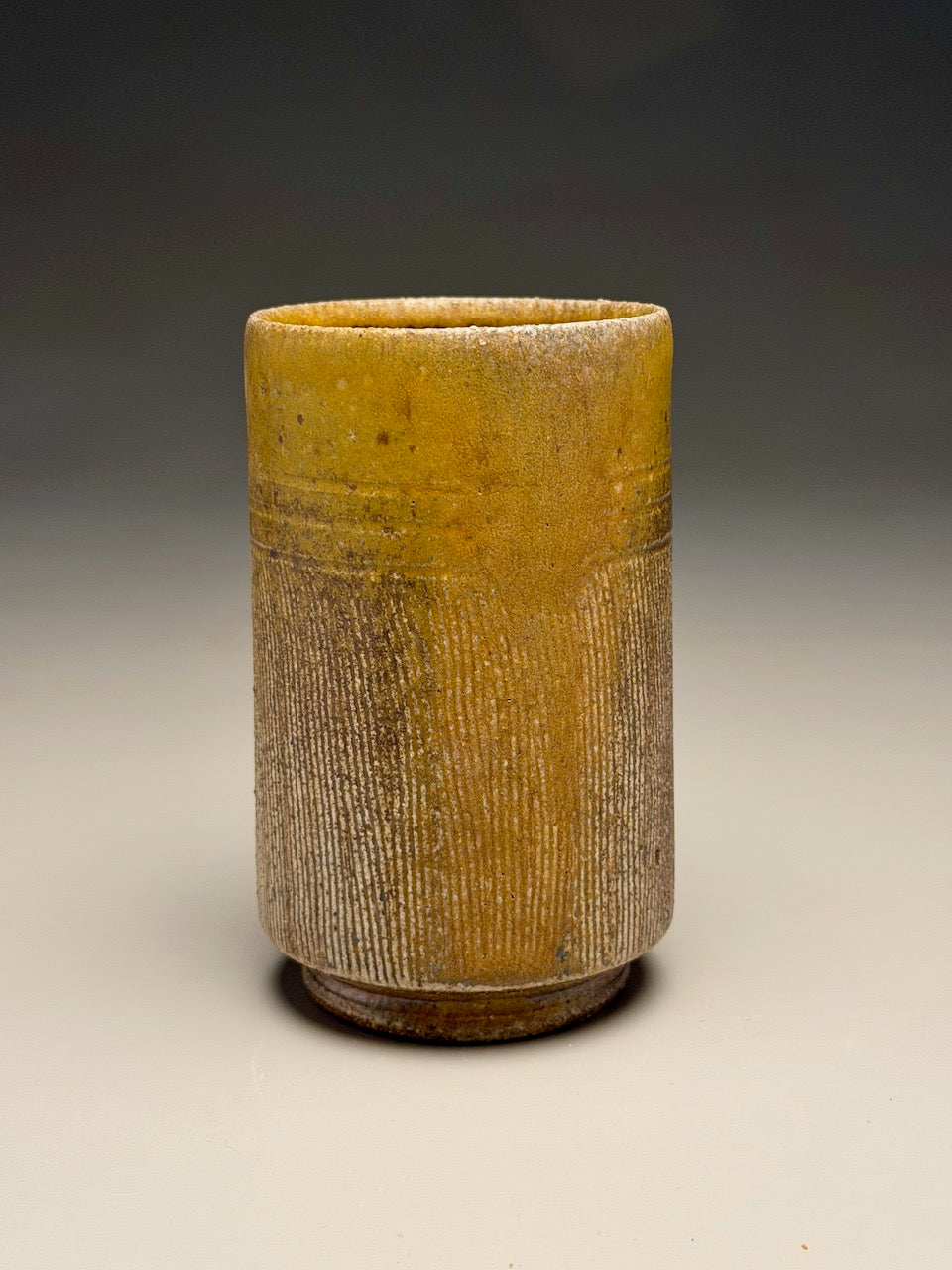 Handmade by Silas Bradley, this salt fired tumbler combines understated beauty with purposeful design. The soft matte finish in ash creates a serene, natural aesthetic that complements any kitchen or dining space. Its distinctive angled silhouette isn't merely decorative—it's a design statement that transforms your daily beverage into a moment of quiet appreciation. Vertical carved lines create interest and provide the desire for a closer look. At 5 inches tall, it's the perfect size for iced coffee, tea, or water, making it an essential addition to your tableware collection. Measuring 3"dia x 5"h.