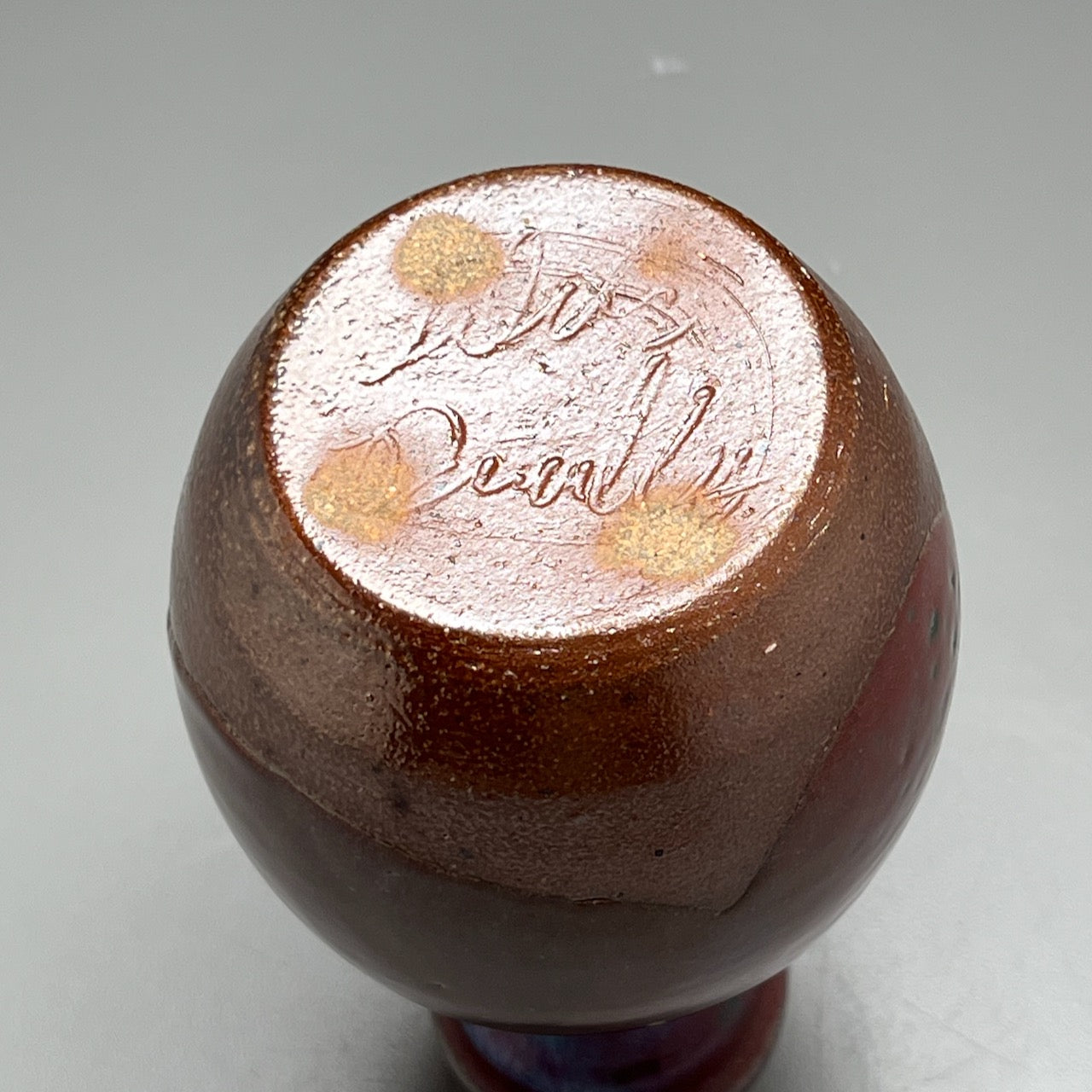A lovely bottle showcasing the newest Ben Owen Pottery proprietary glaze, Aurora.  The variant colors seem as though a heavenly veil has been draped over this earthen salt-glazed bottle.  This Bottle in Aurora and Salt Glazes beautifully blends contemporary style with classic craftsmanship, making it a treasured vase perfect for everyday use. Measuring 4"dia x 7.25"h.