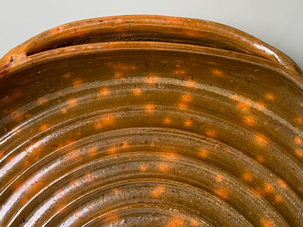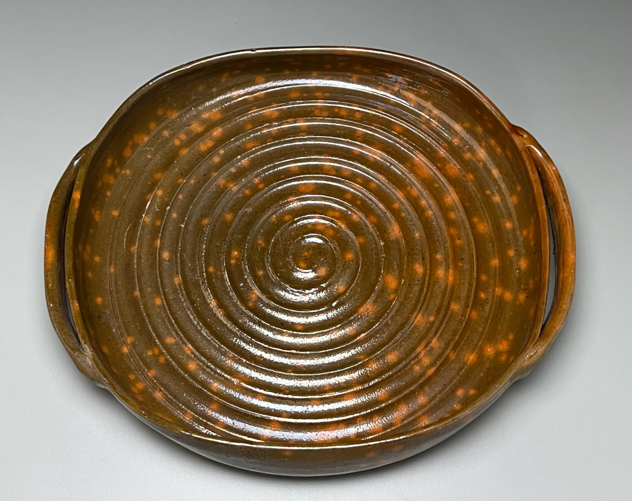 This Bread Tray/Serving Dish in Orange glaze by Ben Owen Sr. makes a colorful addition to any kitchen. Perfect for displaying non-food items such as decorative ornaments and dried flower arrangements. May also be used for serving bread or rolls if lined with a decorative towel, parchment paper, aluminum foil, plastic food wrap, etc. Not for food, baking or liquid use due to the chemical components in the glaze. Measuring 15.25"dia. handle-to-handle x 13”dia. x 2.25”h.
