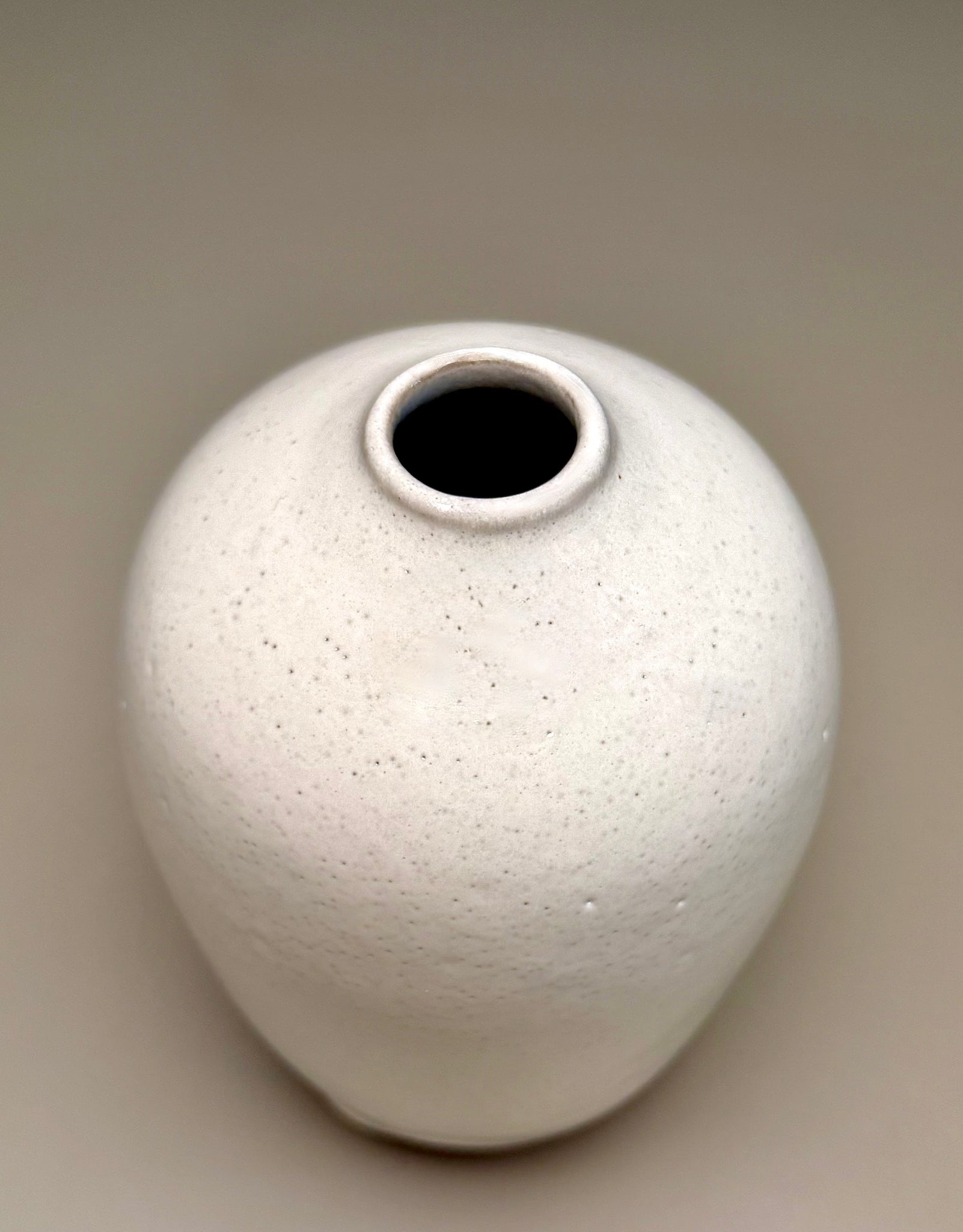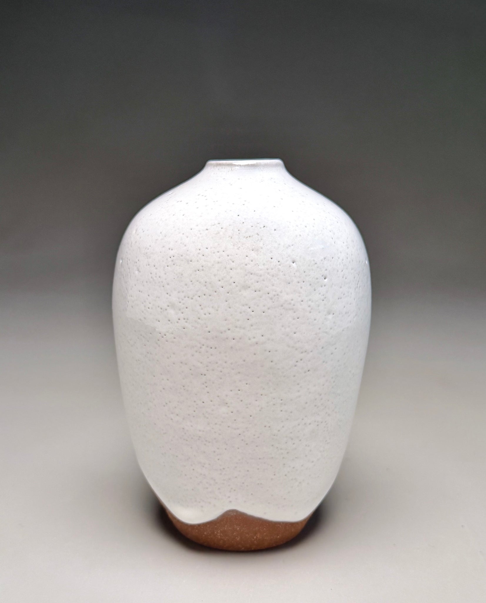A classic and popular shape from Ben Owen III and his family, this Egg Vase creates an elegant understatement to compliment the thick glaze application, resembling the look of icing on a cake. The scalloped design on the base is influenced by techniques seen in early Chinese glazed pottery during the Song and Tang Dynasties and early Japanese techniques. The rich color of the red clay enhances the white glaze coating. Measuring 3.75"w x 6"h.