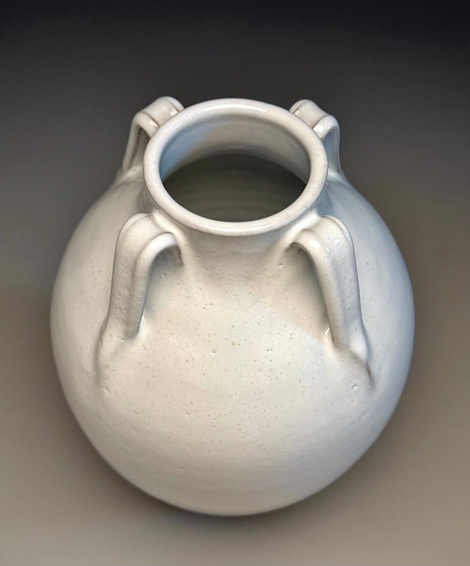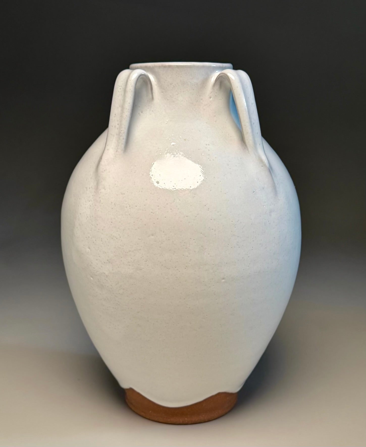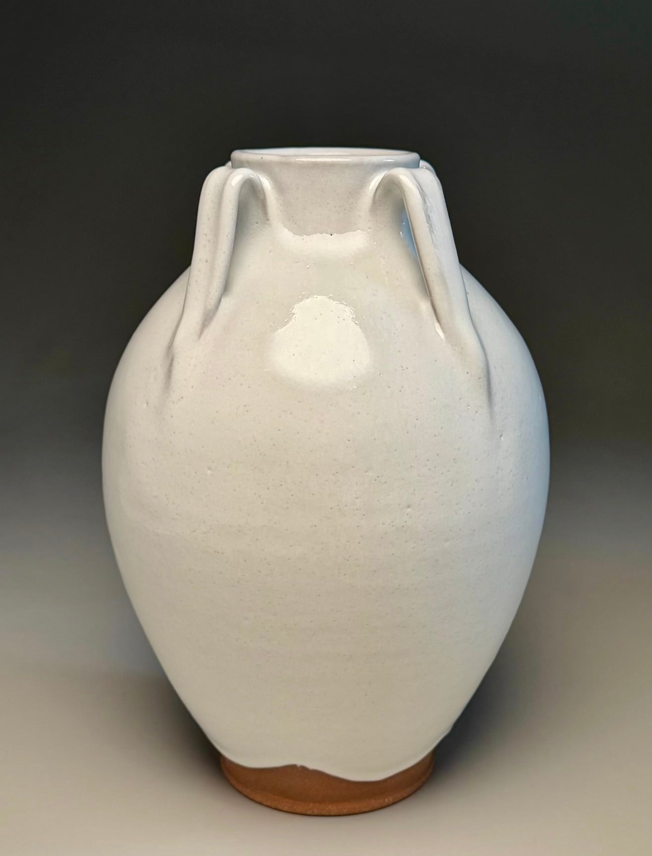 A great vase to display flowers on a table or a mantle. The vase has four handles on the shoulder and a thicker glaze application on the surface giving the look of icing on a cake. This vase shape is a design from Ben III’s grandfather, Ben Owen, Sr. The scalloped design on the base is influenced by techniques seen in early Chinese glazed pottery during the Song and Tang Dynasties and early Japanese techniques. The rich color of the red clay compliments the white glaze coating. Fully functional, this Lily Jar is perfect as a centerpiece in the home or office. Measuring 7.25"w x 11.25"h.