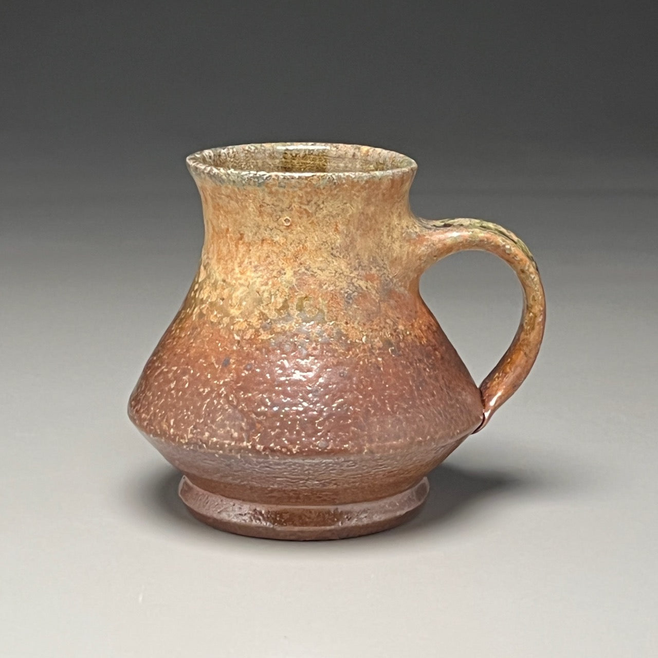 This handcrafted mug showcases the distinctive character of salt kiln firing combined with an ash glaze finish. The sharp angle on this mug creates visual interest and displays the texture effect of salt firing. Dishwasher- and microwave-safe. Measuring 4.25"l x 3.75"w x 4"h.