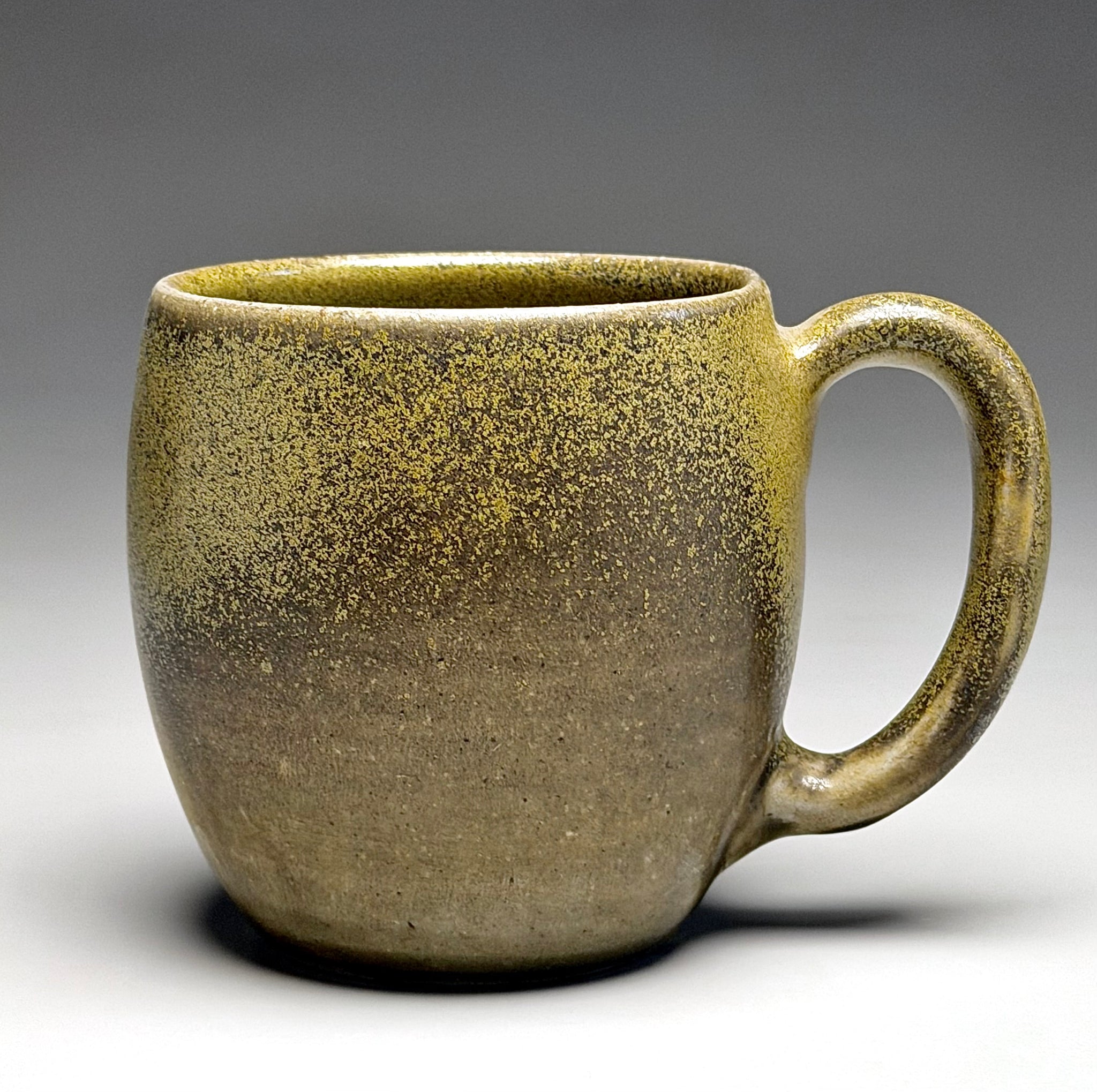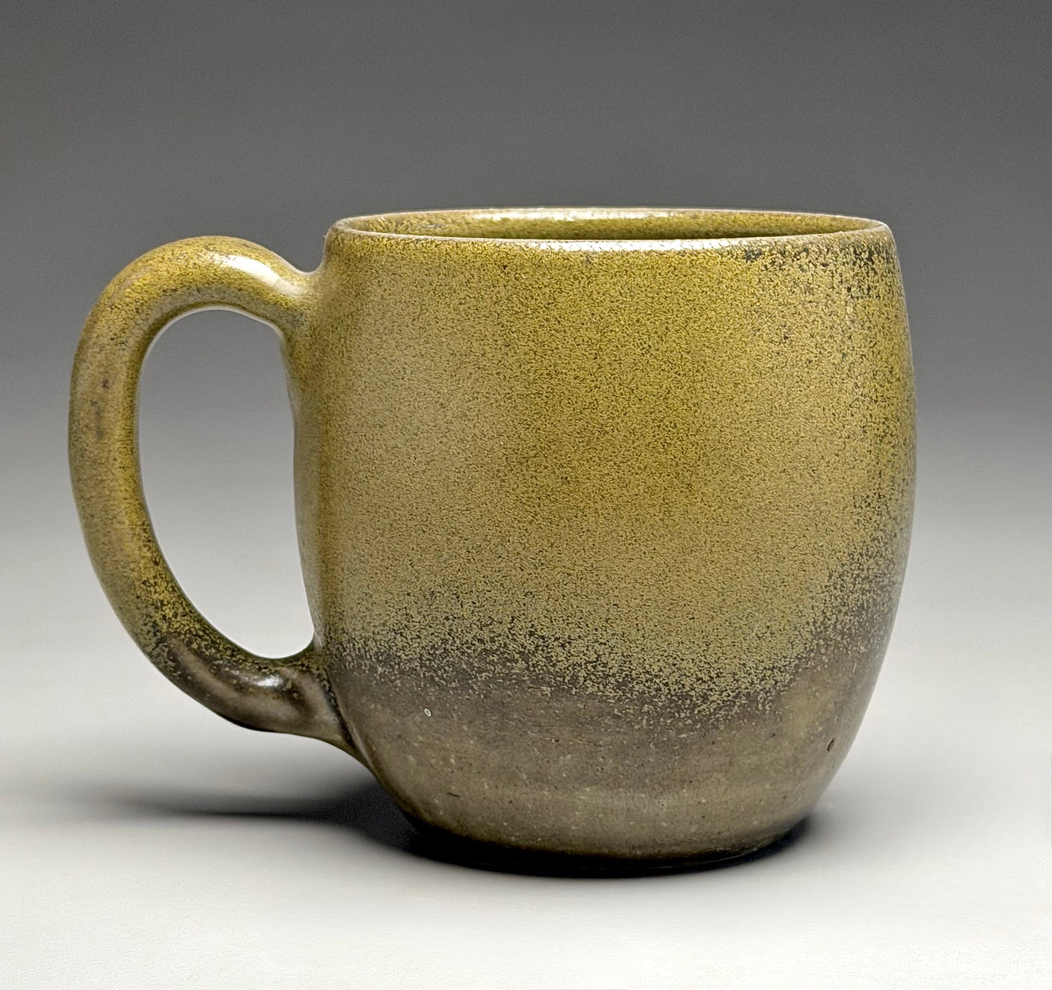 Frogskin is the same glaze as a Teadust glaze but fired in the back of a salt glaze groundhog kiln where salt is added to the firing at the very end. The sodium in the salt reacts similarly to the way bleach works on clothing by bleaching the iron-rich glaze creating an olive green to mustard-colored finish with a glossy surface.