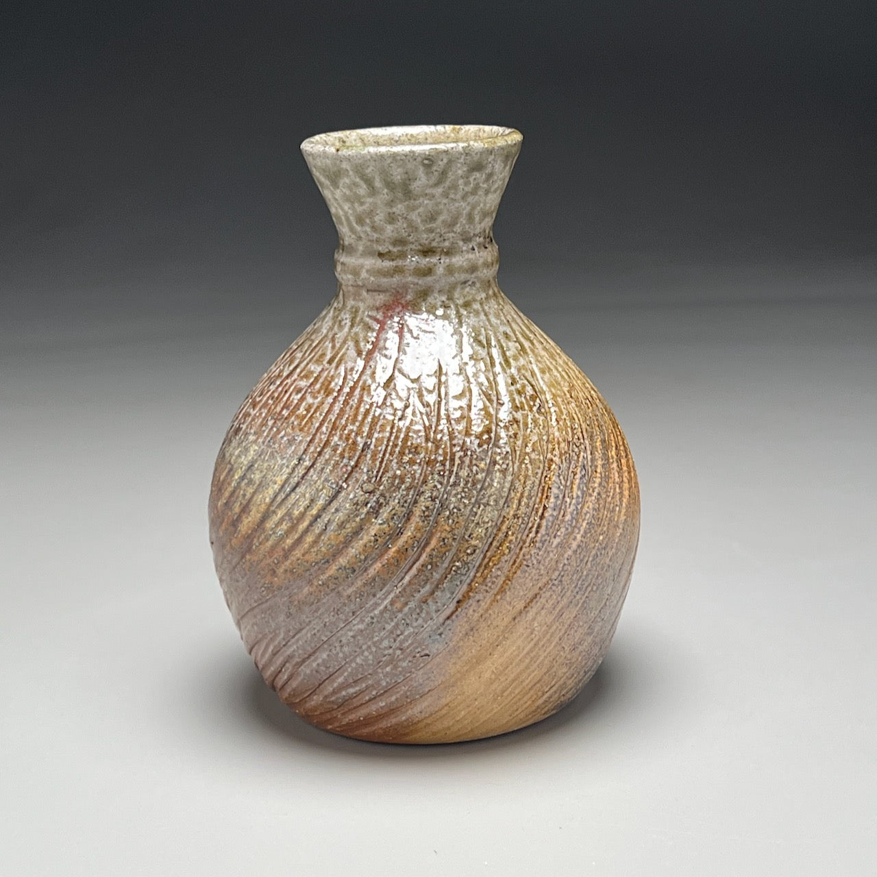 This Combed Bottle in Ash and Salt Glazes can be used for fresh or dried flowers. A unique ornamental vase that will add a rustic elegance to your home or office. A beautiful example of "letting the kiln be the paintbrush". Measuring 4.5"w x 6.25"h.