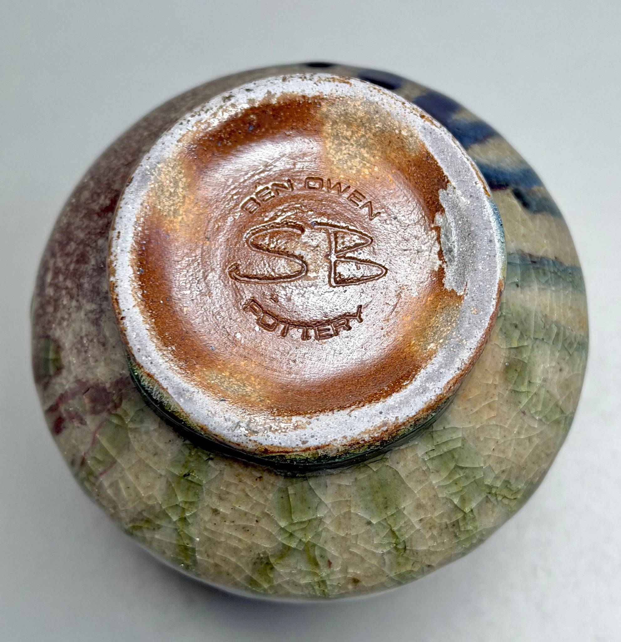 This piece is stamped "Ben Owen Pottery" with initials hand-signed "SB".