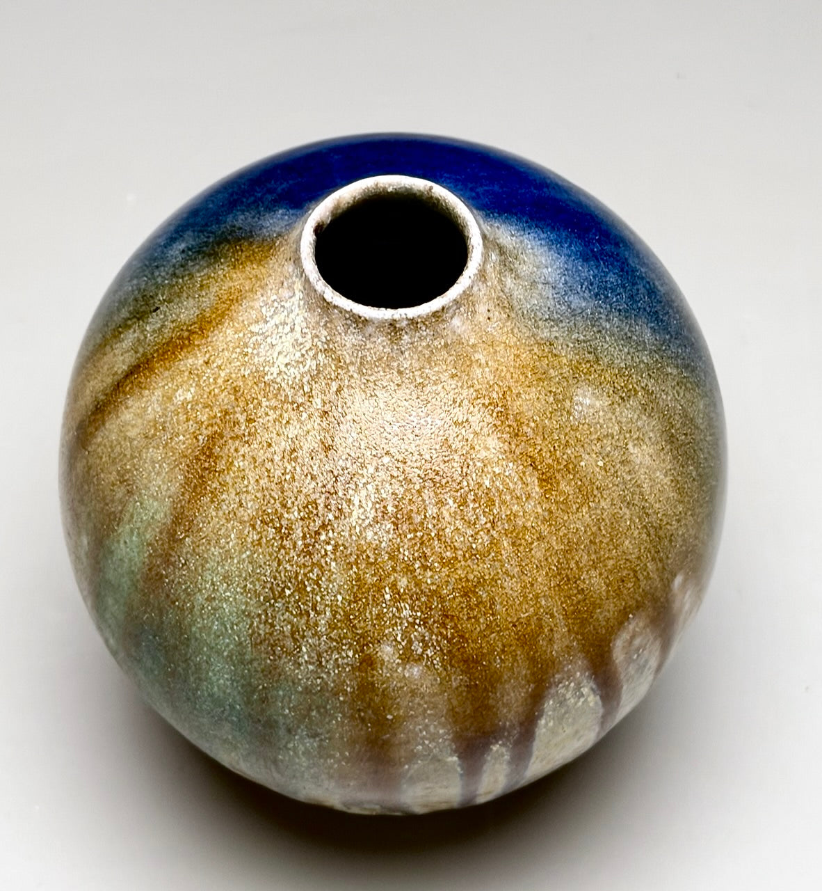 When Ben was in college, he was introduced to a spraying technique using an air-driven spray gun that some potters use to build up layers of glazes on the clay surface. With some experimenting, he was able to create a variety of finishes using accents of 3 to 4 different colors. A glaze made from ash can be used as a top coat to blend or bleach the underlying colors. Some finishes are a base of an iron yellow with cobalt blue or copper green covering. Other colors of orange to silver can develop from the colors overlapping. No two pieces are exactly alike.