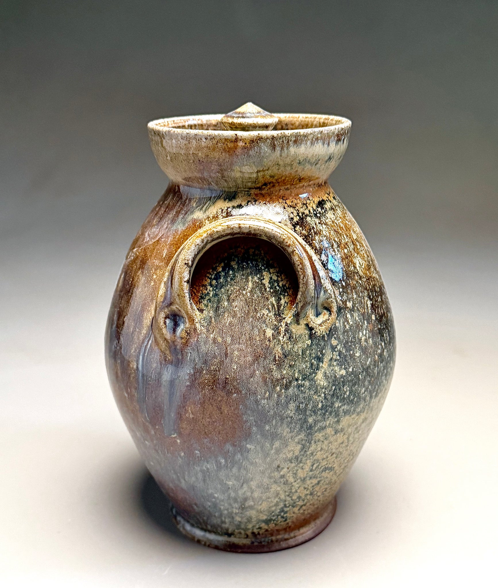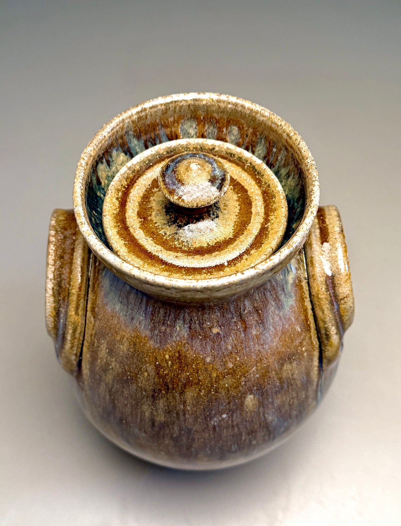 A beautiful handled jar in the cloud blue glaze. With inspiration from the Handled storage Jars that Ben Owen III's Grandfather, (Ben Owen Sr.) used to make. Perfect for storing dry goods, tea, coffee, etc. A beautiful addition to your home. Covered in a new Ben Owen Pottery proprietary glaze blend, Cloud Blue glaze ranges in color from a light violet purple, to a variegated pale icy blue to a clear that shows off the light stoneware clay body underneath. Measuring 5.5”w x 8.25”h Please Note: What appear to be white spots on the surface are reflections from photo lighting.