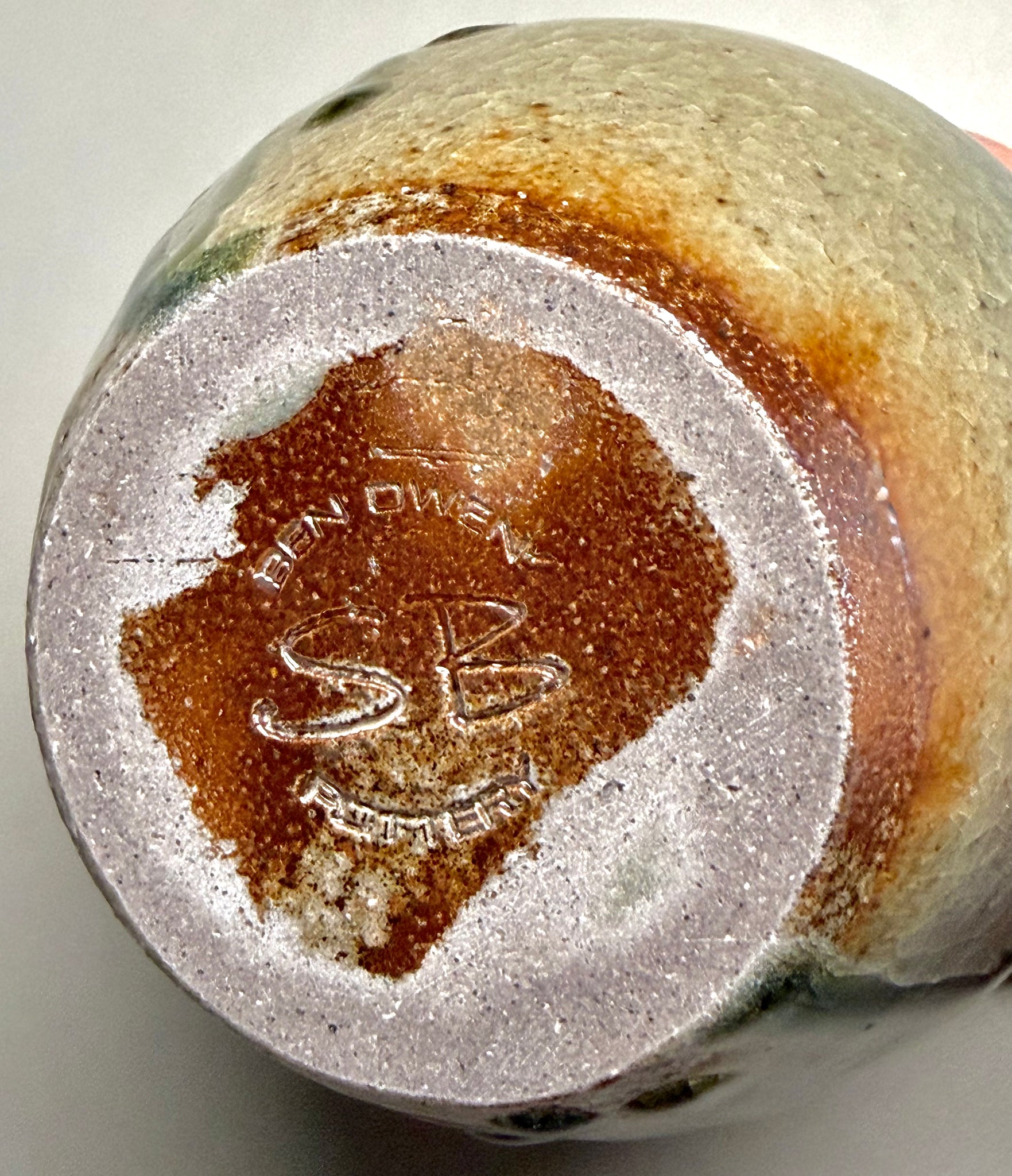 This piece is stamped "Ben Owen Pottery" with initials hand-signed "SB".
