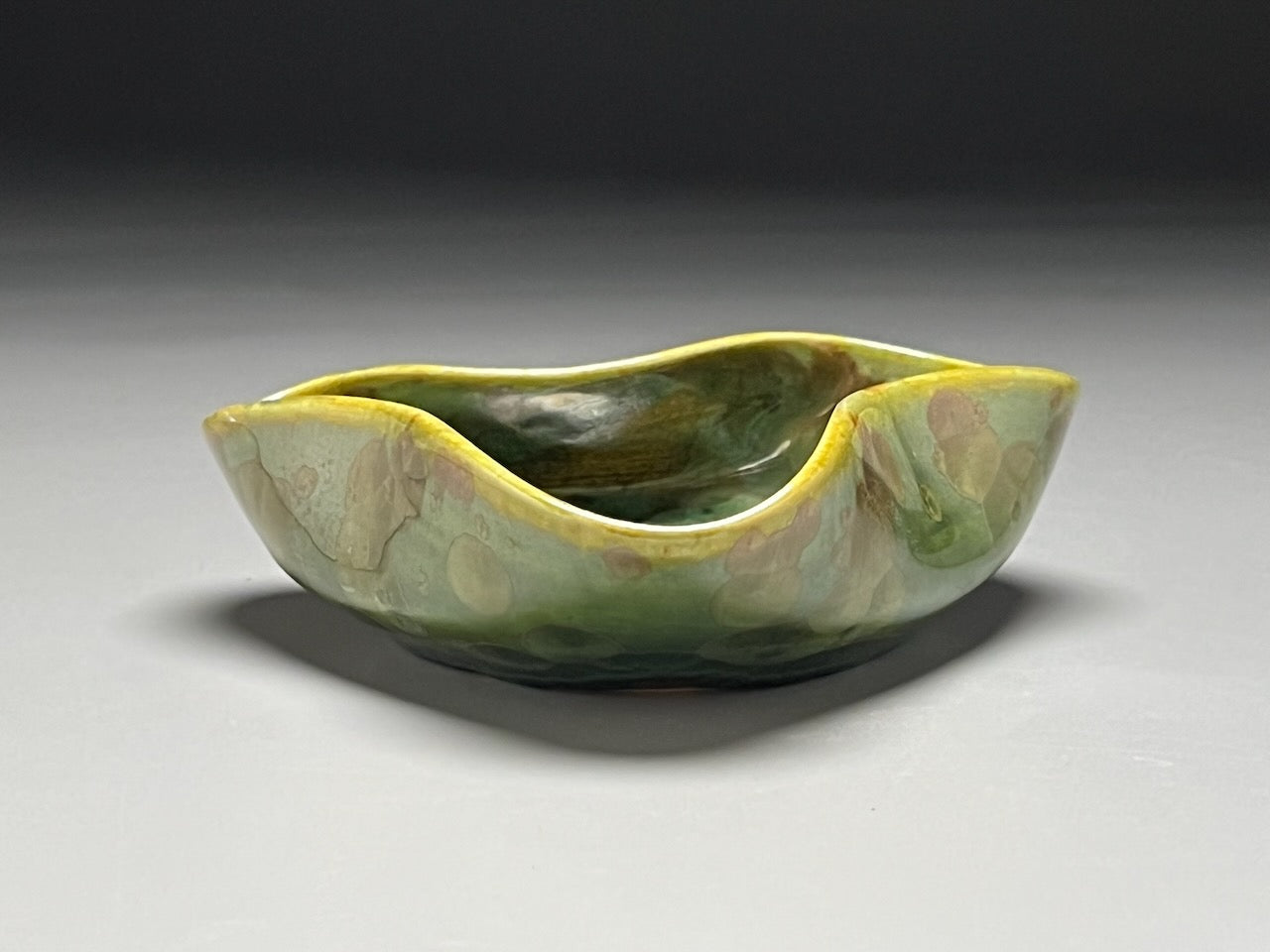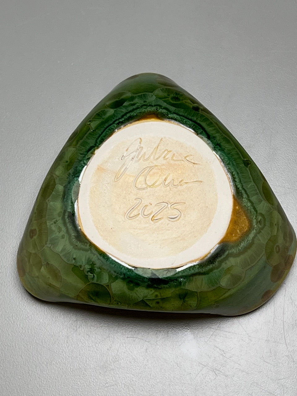 This small dish is finished with a Ben Owen Pottery proprietary glaze, Lily Pad Green Crystalline. The perfect size to use as a jewelry dish, candy dish or for serving small appetizers. Dishwasher-safe. Measuring 5.25"dia. x 1.75"h