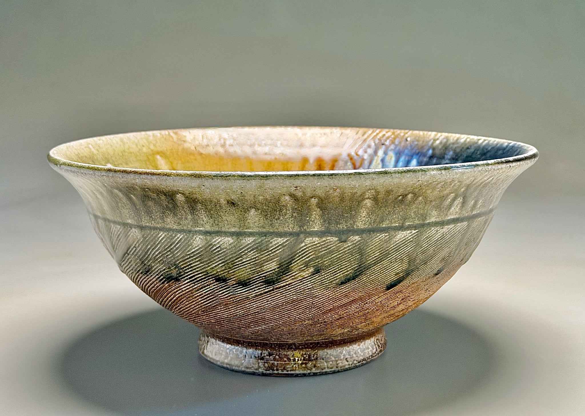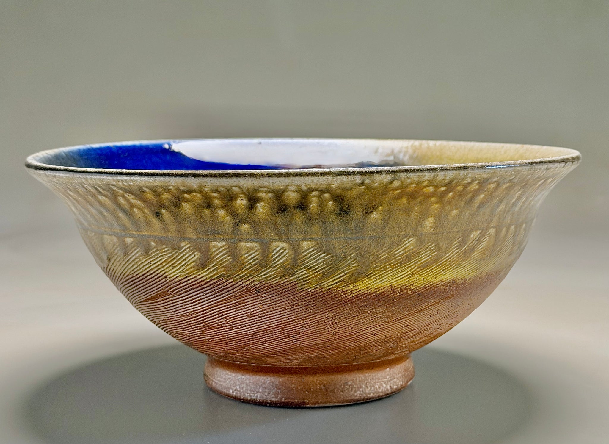 This large Combed Trumpet Flair Bowl in Multi-Layered Glazes is a beautiful example of the joy of wood firing. As the kiln heats, the runny nature of the pre-applied Ash Glaze blends with the Cobalt and Yellow Matte glazes to form a unique color combination that is intentionally different from piece to piece.