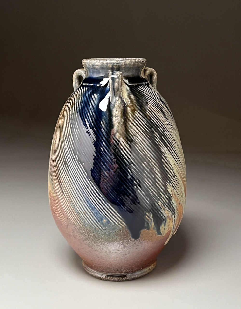 This Edo Jar with Combed Lines in Multi-Layer Glaze beautifully displays Ben III's glaze layering technique.  A preparatory set-up of a blend of wood ashes, as well as the cobalt pigment, are sprayed in layers across the top of the vase.  During the firing process, the ash melts and creates its own glaze.  Along its melting journey, the ash glaze picks up the cobalt pigment and creates a flow of movement for the rich colorant.