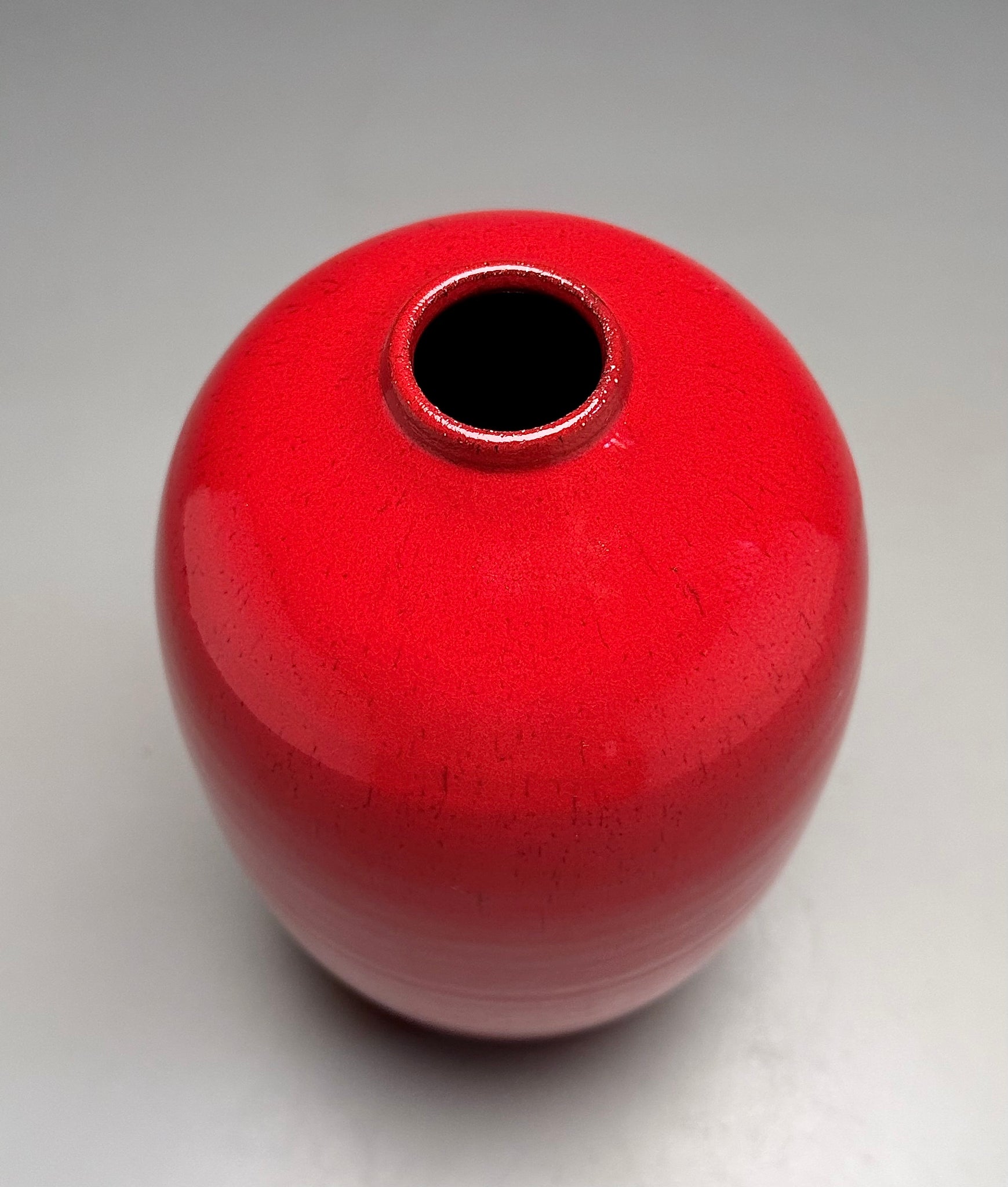 Chinese Red has become one of Ben III’s signature glazes over the past 35 years. Ben’s father, Ben Wade Owen Jr., developed the glaze after many customers requested a red finish. Chinese Red was not produced by Ben’s grandfather, Ben Owen Sr., although many of the forms that he studied early on in his career were shapes from China that included a red finish. The red glaze is reminiscent of the old Chinese Red over glazes used in the 16th century and has worked well with Ben III’s simple Asian translations. The red glazed pottery cannot be used for food or liquid due to the limitation of firing temperature. If using for flowers, place a plastic cylinder or bowl inside the vessel to hold water.
