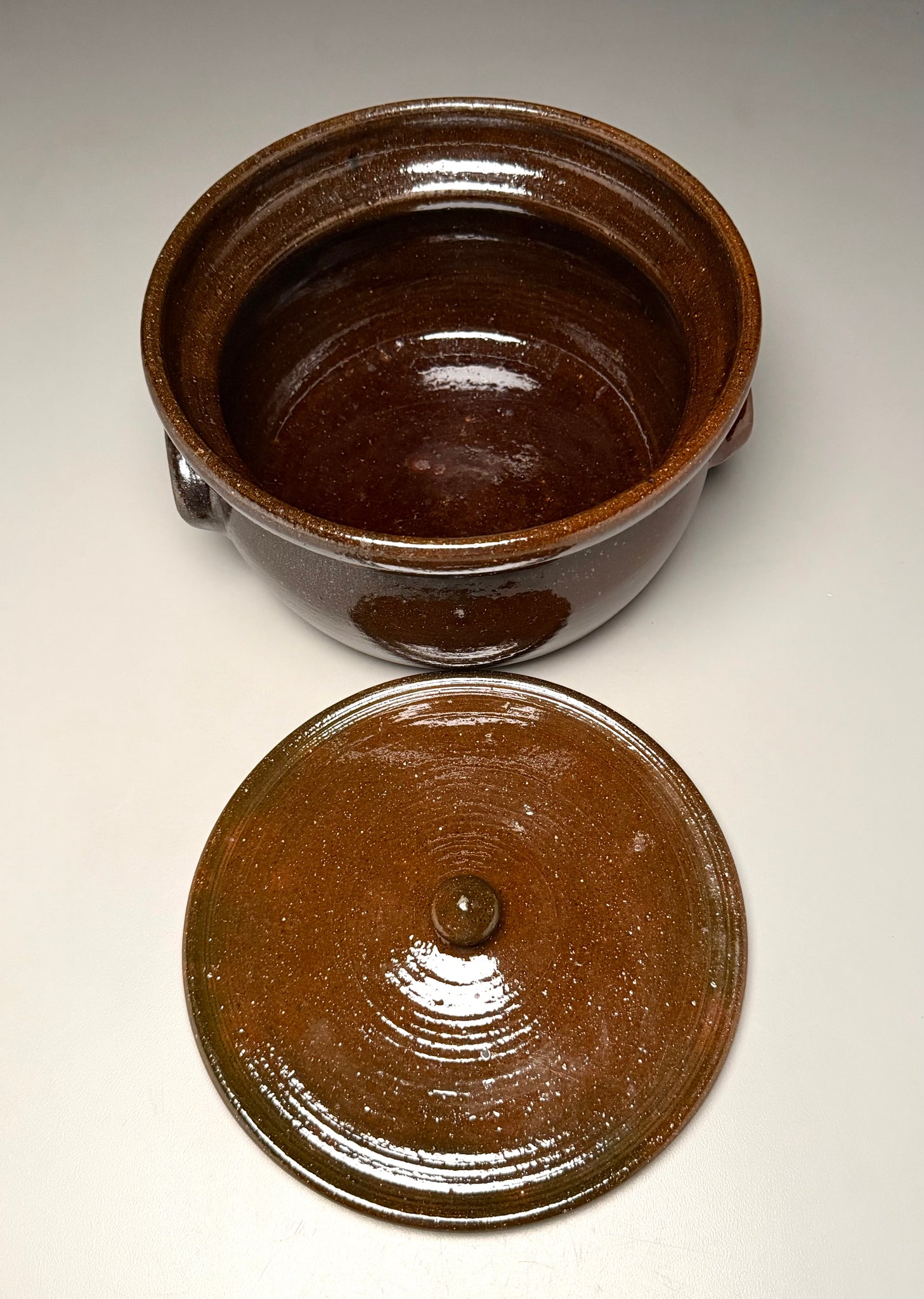 A beautiful casserole made by Ben Owen Sr. circa the 1960s at Old Plank Road Pottery (now Ben Owen Pottery). A well preserved piece of North Carolina history! Measuring 9.25"dia. x 5"h. Not for food, baking or liquid use due to the chemical components in the glaze.