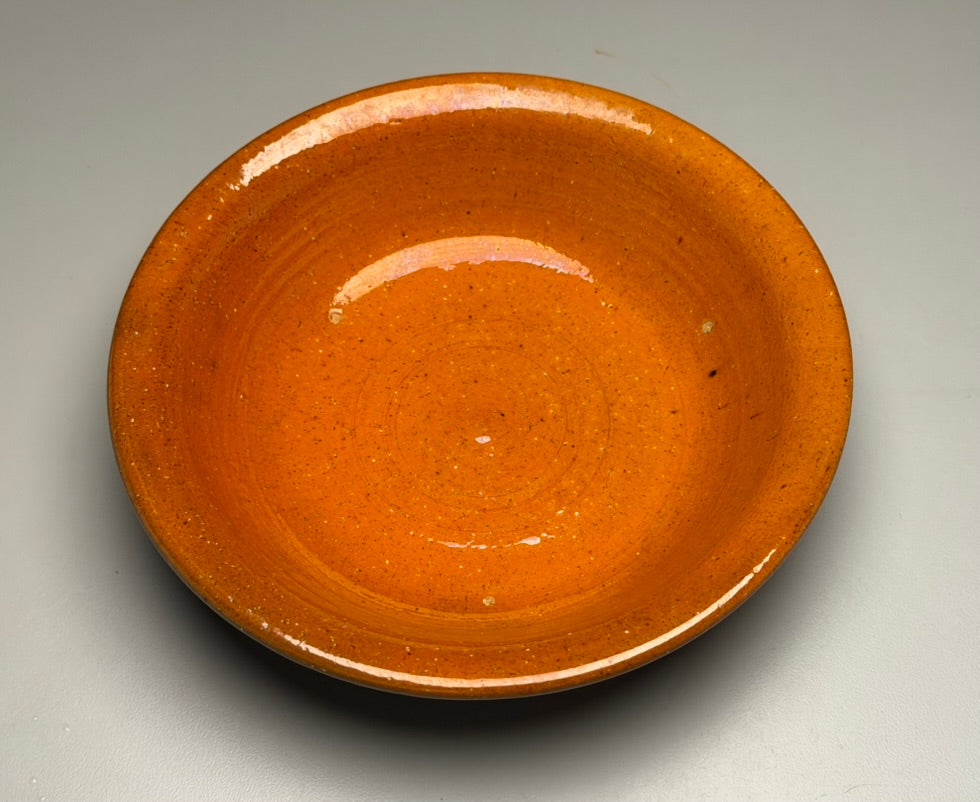 This Pie Dish in Orange glaze by Ben Owen Sr. makes a colorful addition to any kitchen. Perfect for displaying non-food items such as decorative ornaments and dried flower arrangements. May also be used for serving bread or rolls if lined with a decorative towel, parchment paper, aluminum foil, plastic food wrap, etc. For decorative use only. Not for food, baking or liquid use due to the chemical components in the glaze.