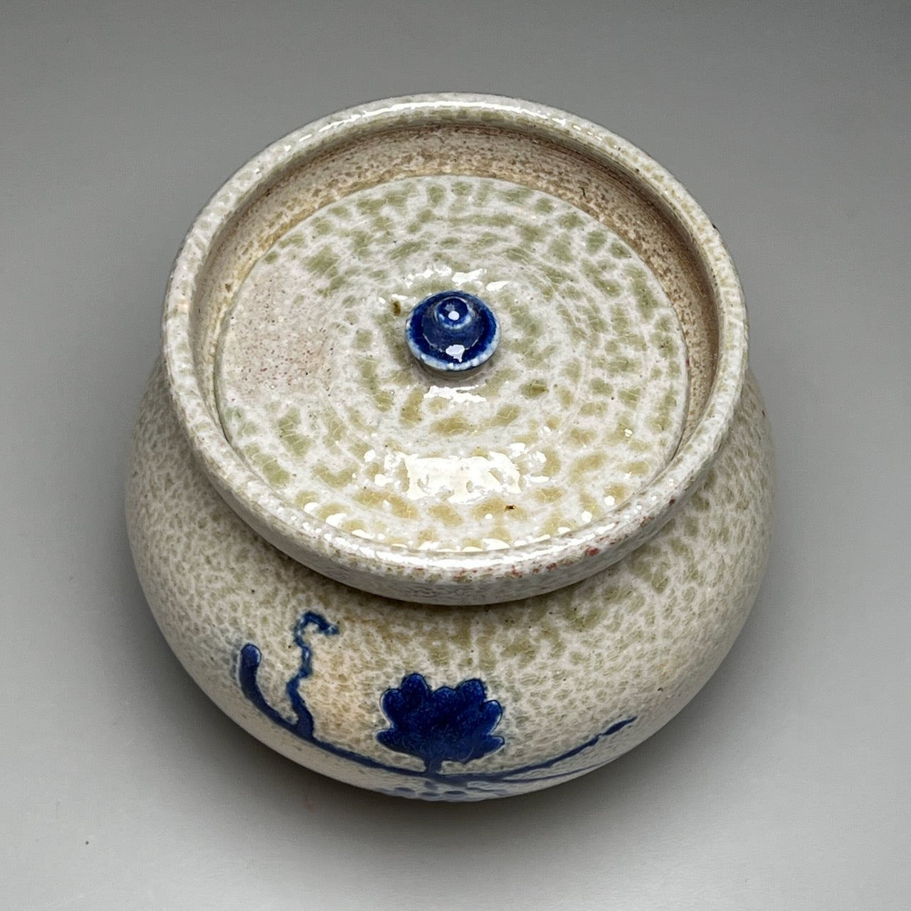 An exquisite Covered Jar made by Ben Owen, Sr. circa 1960. Salt-glazed and wood-fired with Cobalt grapevine design. Measuring 6”w x 5.75"h at handle tip/top of flair.