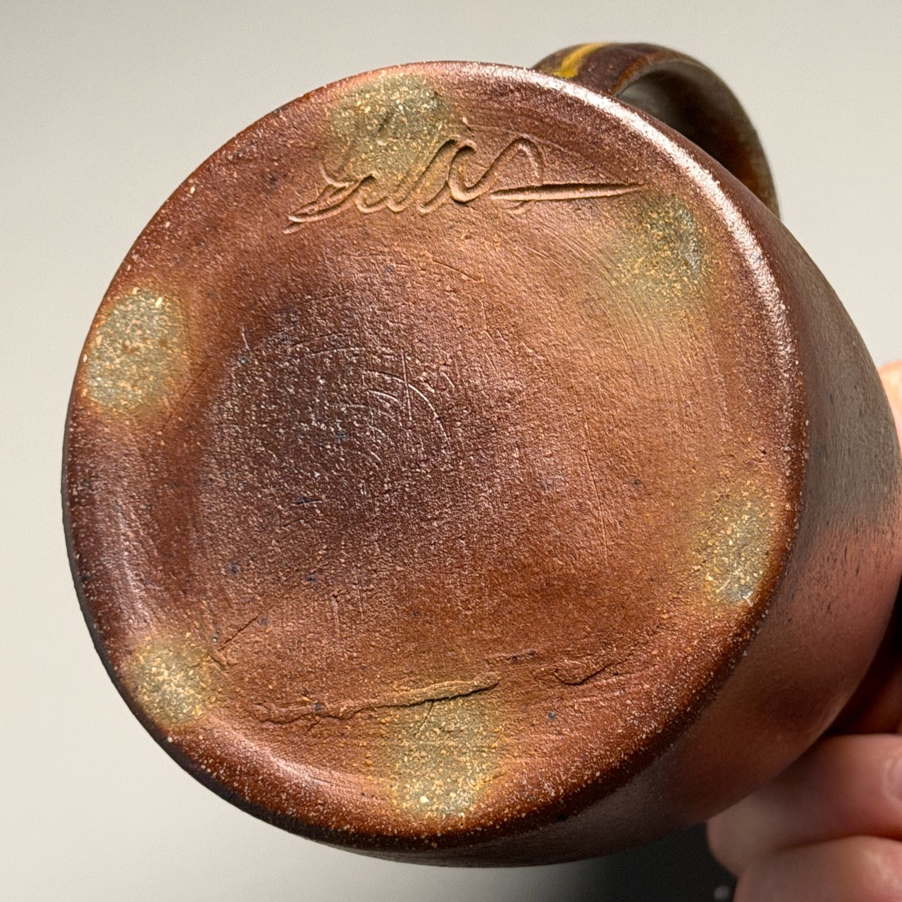 A sturdy, handsome Tankard Mug by studio apprentice, Silas Bradley. Accented with a Ben Owen Pottery proprietary blend glaze, Yellow Matte, along with an applied Ash Glaze. The joy of wood firing! Dishwasher- and microwave-safe. Measuring 5.25"l x 4"w x 5.75"h.